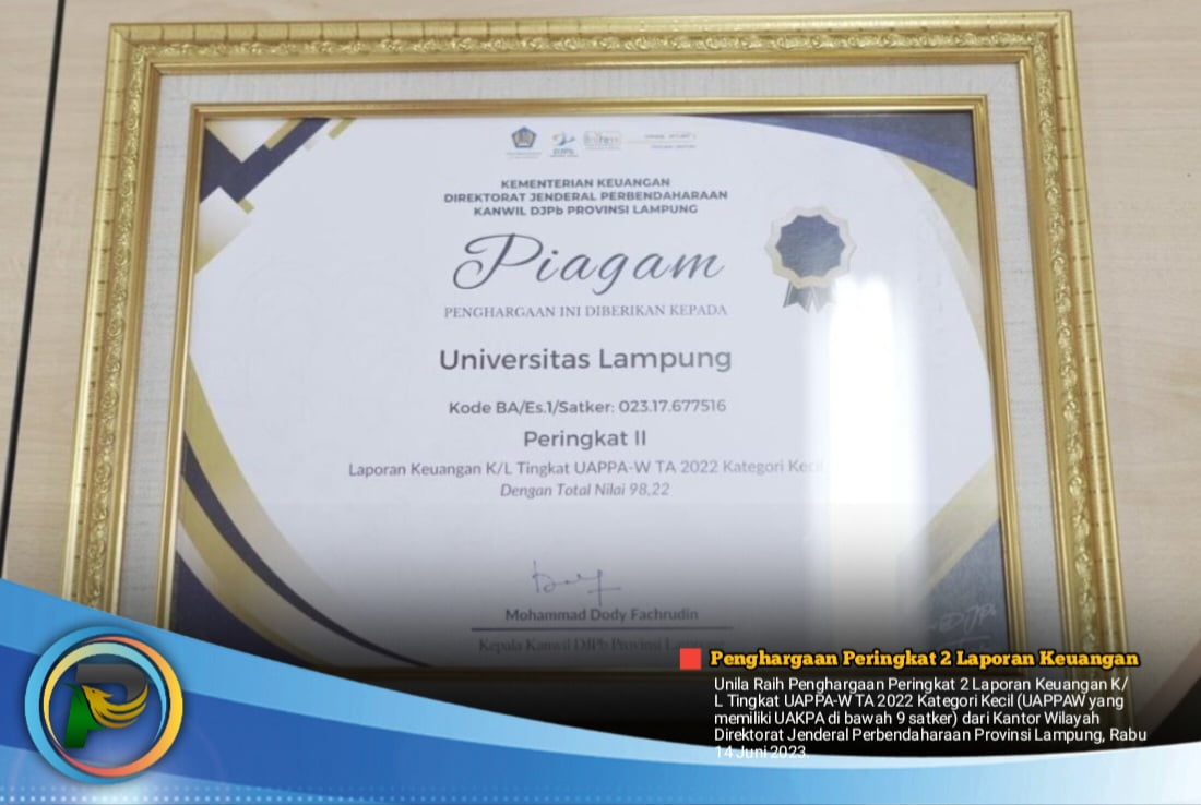 psiaceh.or.id/ – Universitas Lampung (Unila) terima penghargaan peringkat 2 Laporan Keuangan K/L Tingkat UAPPA-W TA 2022 Kategori Kecil (UAPPAW yang memiliki UAKPA di bawah 9 satker) dari Kantor Wilayah Direktorat Jenderal Perbendaharaan Provinsi Lampung, Rabu (14/06/2023).
